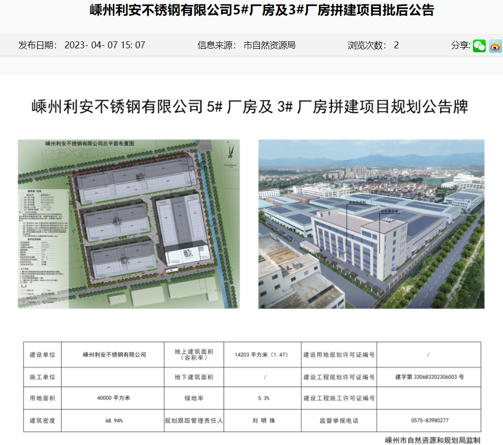 嵊州利安不锈钢有限公司5#厂房及3#厂房拼建项目批后公告